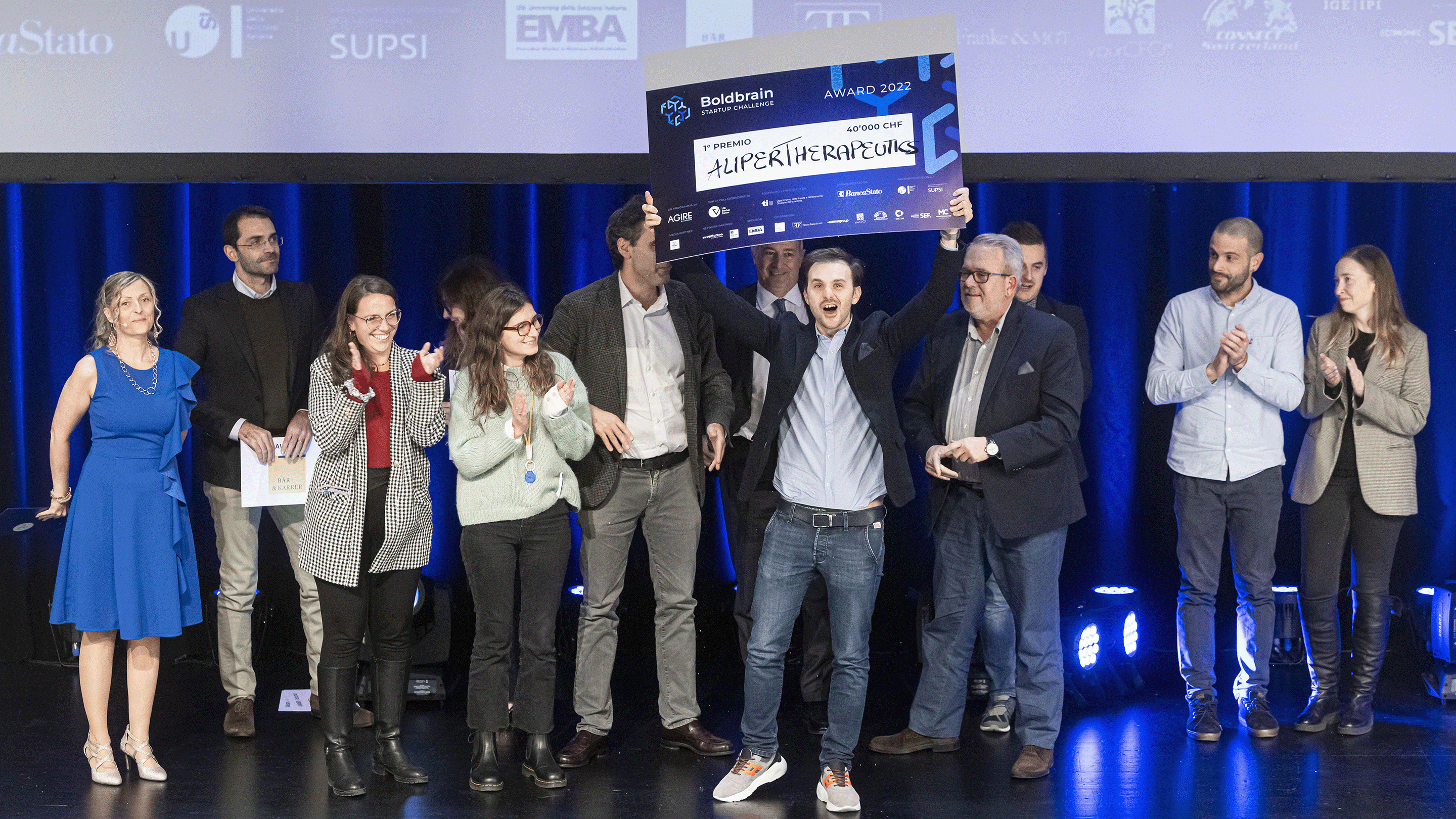 The winners of the 2022 edition of the Boldbrain Startup Challenge, the acceleration programme for innovative ideas organised by Fondazione Agire with the support of USI Startup Centre and sponsored by the Department of Finance and Economy (DFE) of the Canton Ticino and BancaStato, were announced on December 13th at the Palazzo dei Congressi in Lugano in front of 550 participants. AliperTherapeutics won the first prize, a cash cheque of CHF 40.000 and a full scholarship for USI EMBA worth CHF 52.000. The audience award went to Revozona.