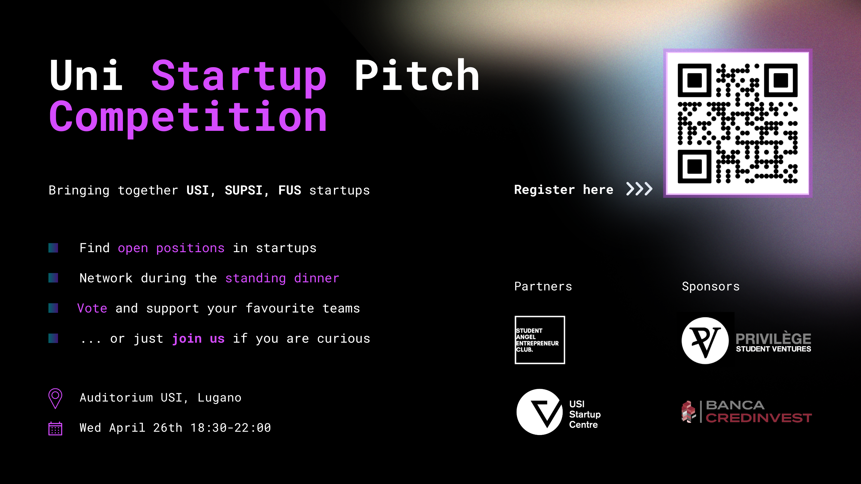 Join the startup pitch competition organised by Student Angel Entrepreneur Club in partnership with USI Startup Centre and with the support of Privilège Student Ventures and Banca Credinvest to