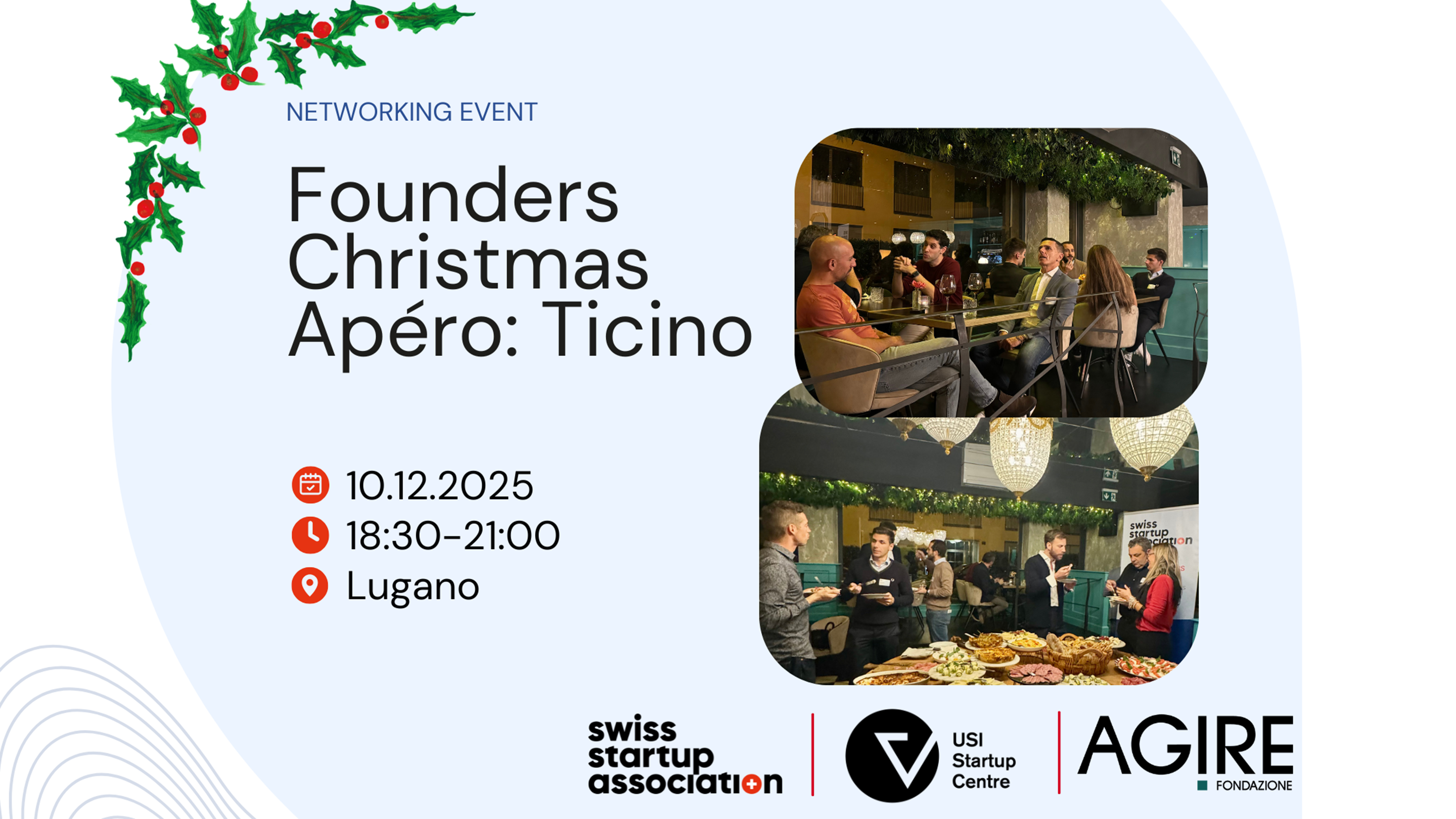 Together with the Swiss Startup Association and Fondazione Agire, we’re co-hosting an inspiring networking evening at one of the Christmas Chalets, right in the heart of Piazza Riforma in Lugano, to celebrate the season and the spirit of entrepreneurship!